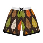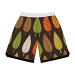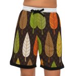Autumn leaves basketball shorts made of 100% moisture-wicking polyester fabric, perfect for sports activities. Features ribbed-knit bottom hems, two side pockets, and black detailing. Provides a cool and comfortable fit for basketball enthusiasts and athletes. Ideal for fall season sports events and casual wear.